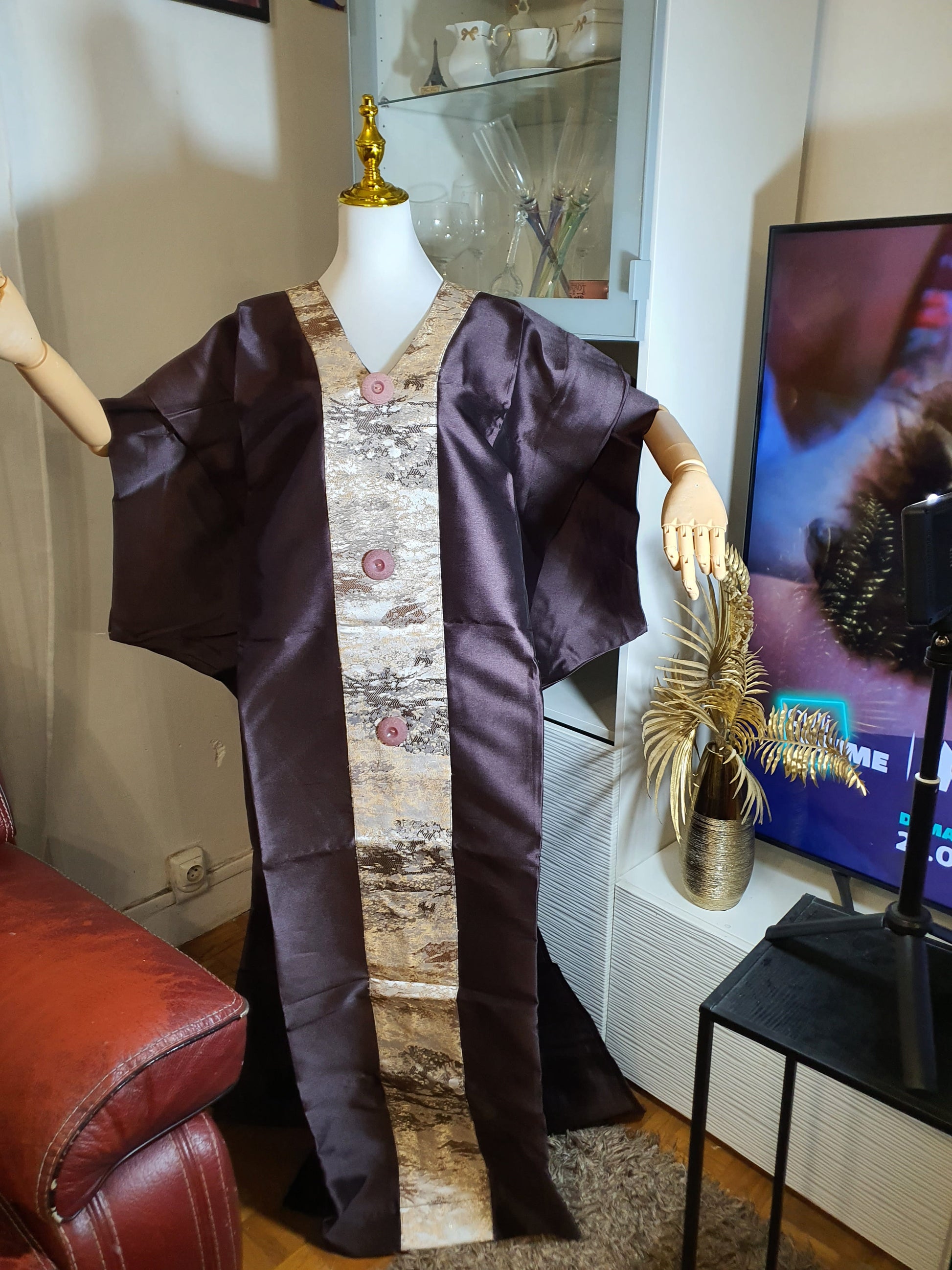 Quel bubon est un hymne à la noblesse des couleurs naturelles et à la finesse du design. Avec son tissu satiné orné de reflets bronze, beige et bruns, il évoque les textures de la terre, sublimées par une bande centrale en chocolat foncé qui allonge visuellement la silhouette.
