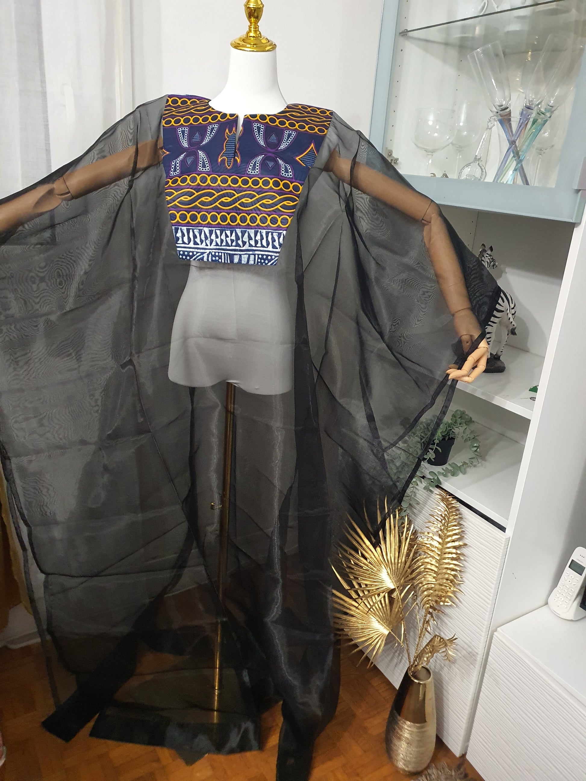 Ce kimono femme transparent noir est une pièce audacieuse et raffinée qui marie subtilement modernité et identité africaine. Son plastron en wax richement coloré (bleu, violet, jaune) met en valeur la poitrine et attire le regard avec des motifs géométriques typiques de l’Afrique.