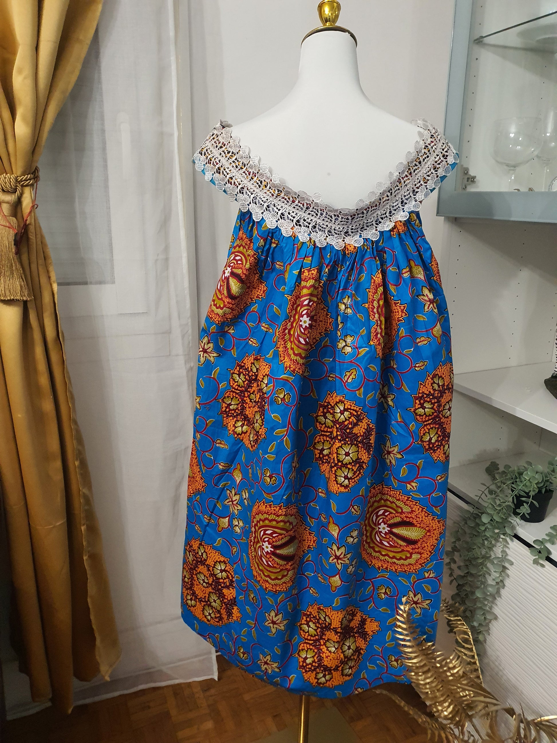 Cette robe africaine mini kaba incarne à la perfection l’élégance du style traditionnel allié à une touche moderne. Réalisée dans un wax bleu vif, elle présente de jolis motifs floraux orange et rouges, rehaussés d’un col en dentelle blanche délicatement travaillé. Sa coupe ample et sans manches offre une liberté de mouvement idéale et un confort inégalé.